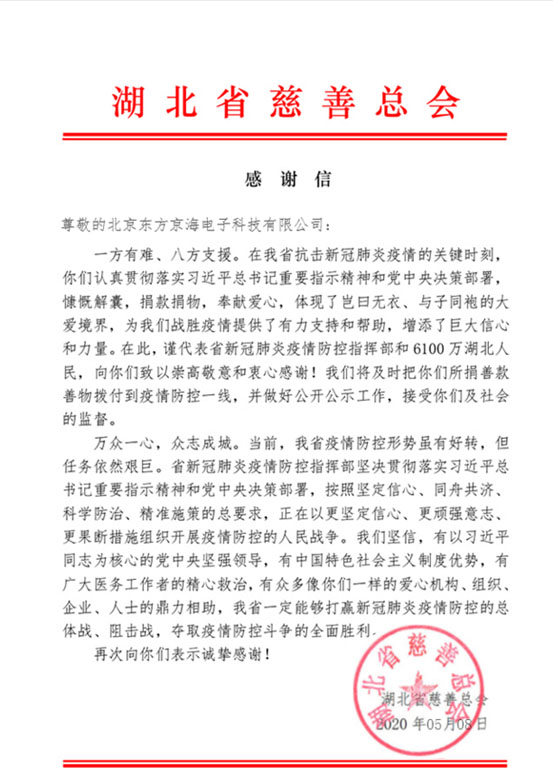 2020.5.8 公司接收到“湖北省慈善總會(huì)”的感謝信