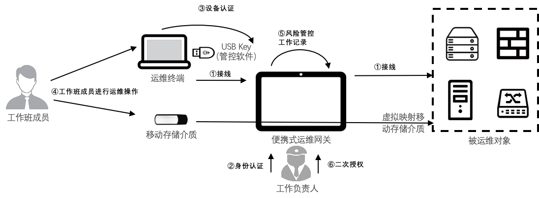 2.通過賬號(hào)口令、生物特征等方式在便攜式運(yùn)維網(wǎng)關(guān)上完成工作負(fù)責(zé)人的身份認(rèn)證,通過USB Key方式完成運(yùn)維終端的設(shè)備認(rèn)證。