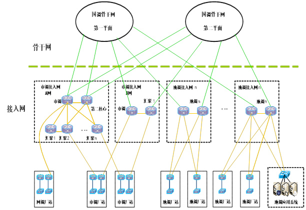 針對(duì)區(qū)域級(jí)電力調(diào)度數(shù)據(jù)網(wǎng)的網(wǎng)絡(luò)規(guī)劃,京海公司提出三層網(wǎng)絡(luò)結(jié)構(gòu)設(shè)計(jì),即核心層、匯聚層、接入層。核心層為網(wǎng)絡(luò)業(yè)務(wù)的交匯中心,通常情況下核心層只完成數(shù)據(jù)交換功能;匯聚層位于核心層和接入層之間,主要完成業(yè)務(wù)的匯聚和分發(fā);接入層主要將用戶(hù)業(yè)務(wù)接入網(wǎng)絡(luò),實(shí)現(xiàn)質(zhì)量保證和訪(fǎng)問(wèn)控制。層次化網(wǎng)絡(luò)結(jié)結(jié)構(gòu)設(shè)計(jì)如下所示: